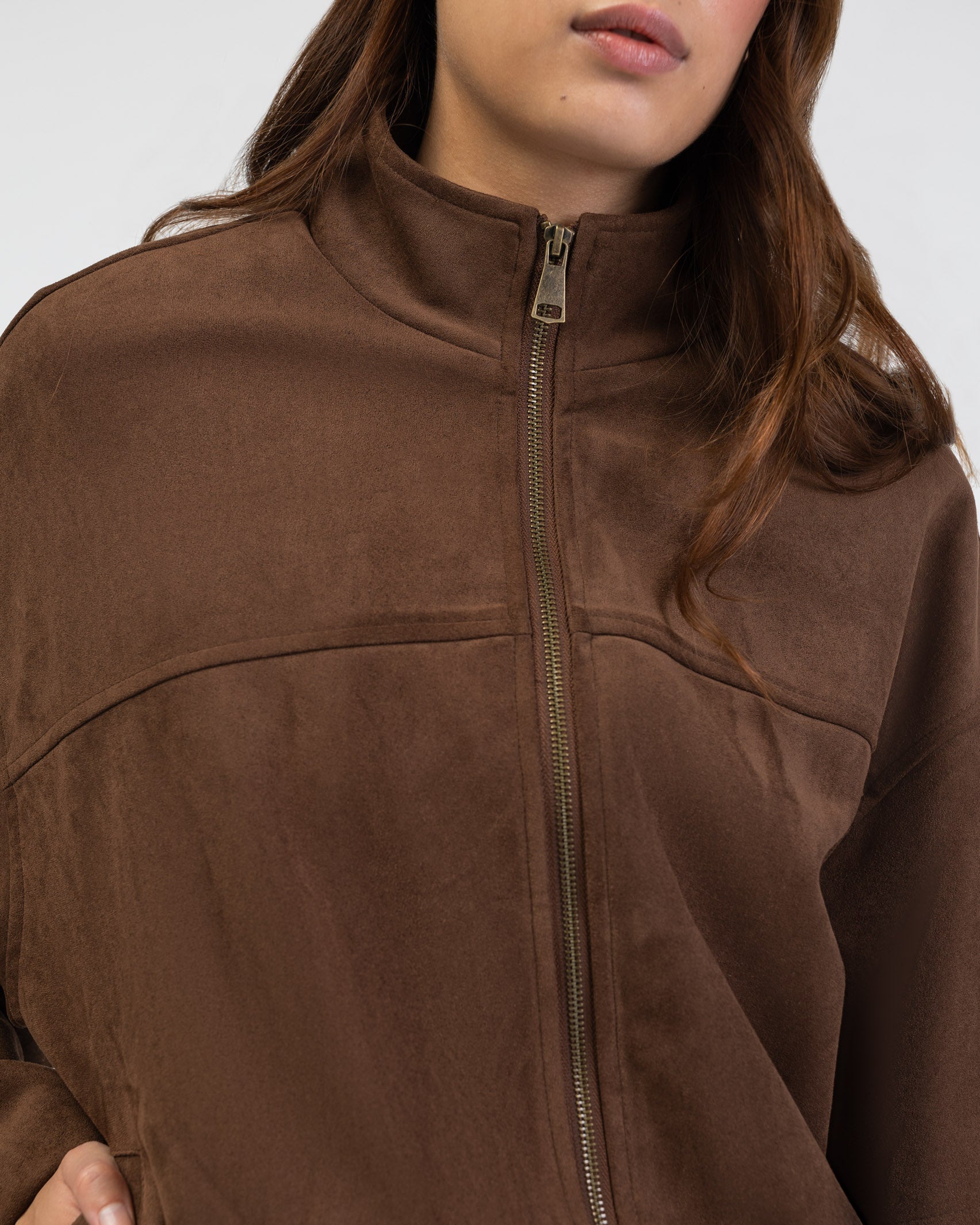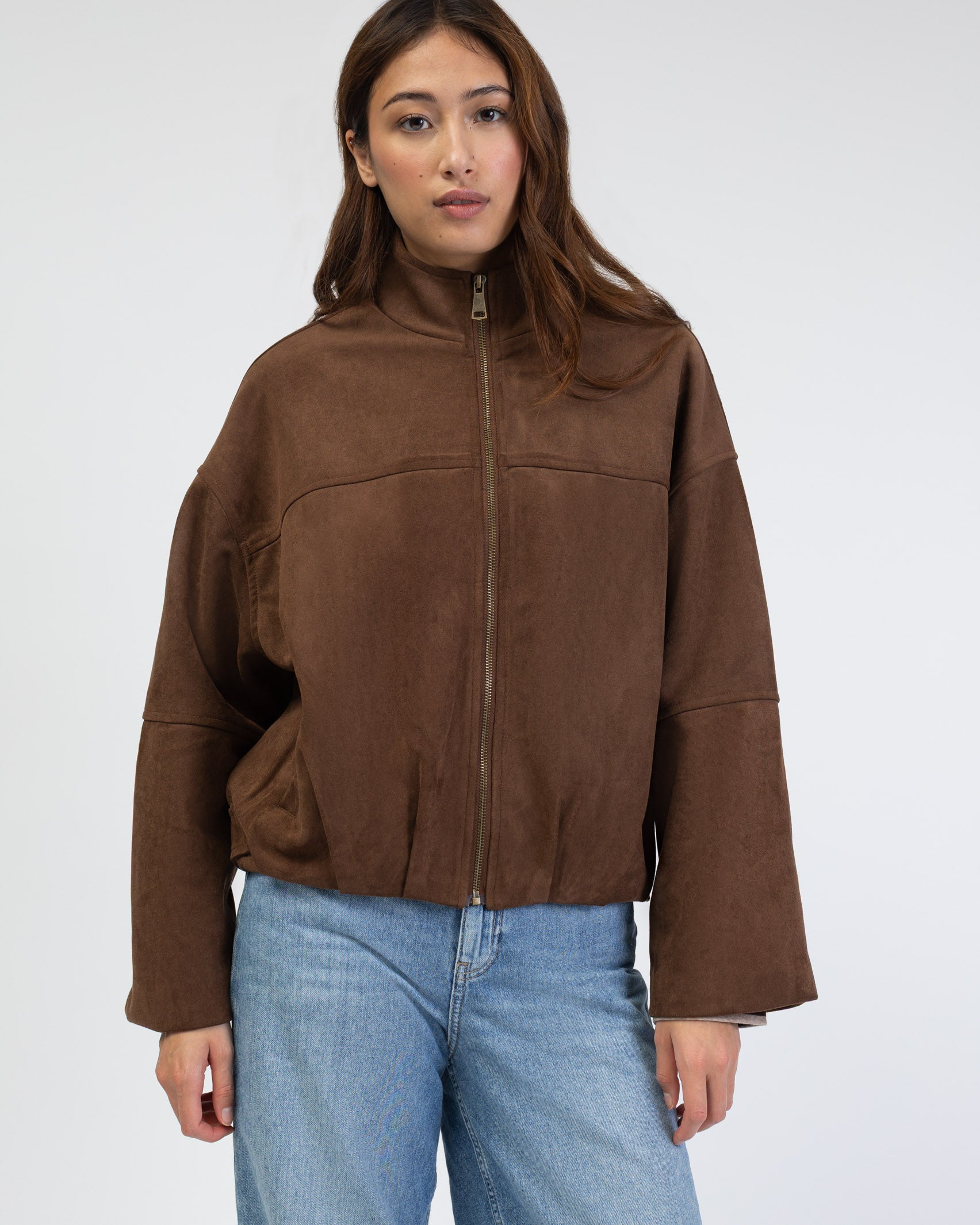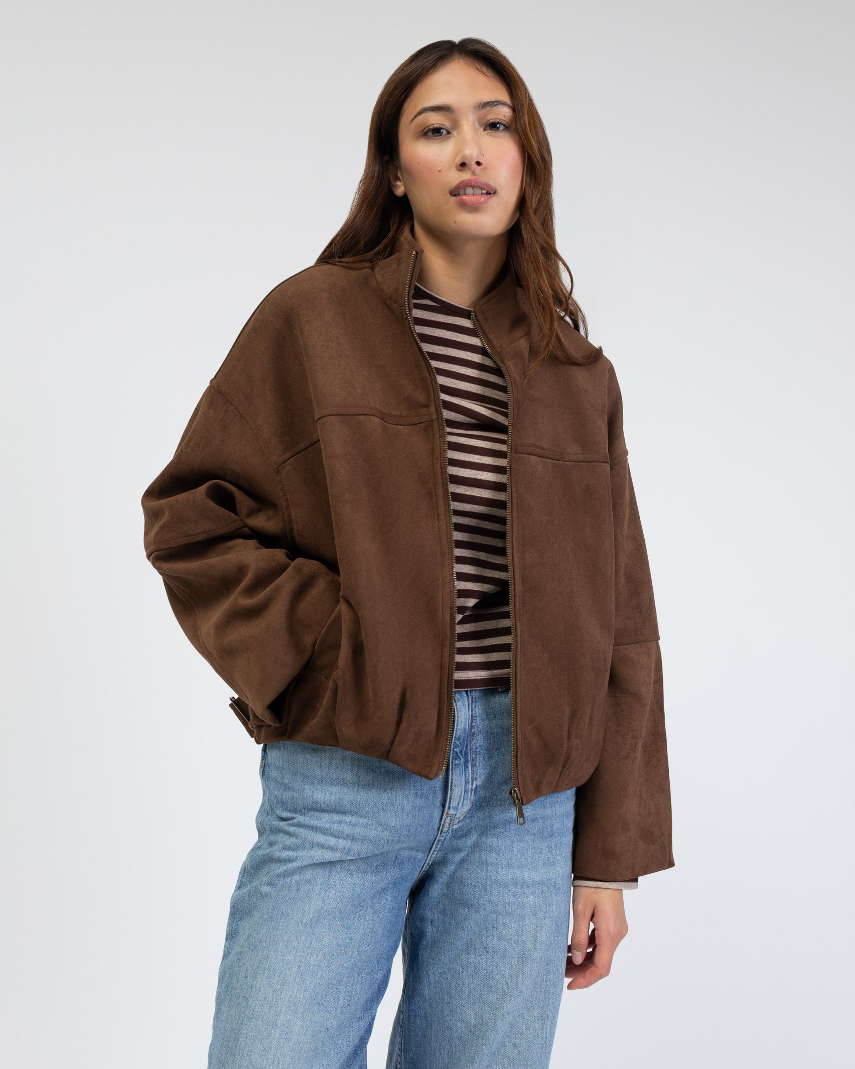 - Bomberjacke in Wildlederoptik mit Ballonsaum und Stehkragen