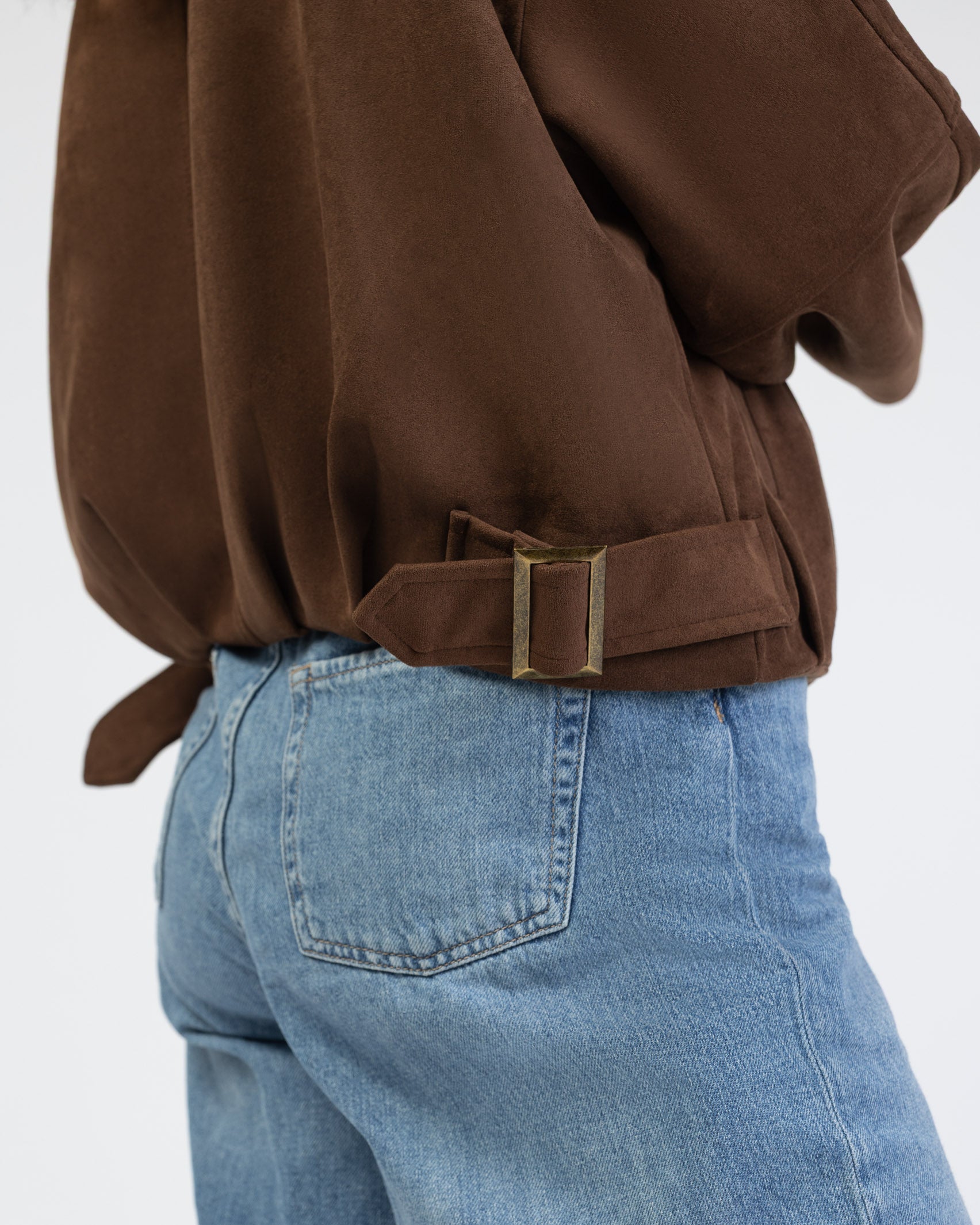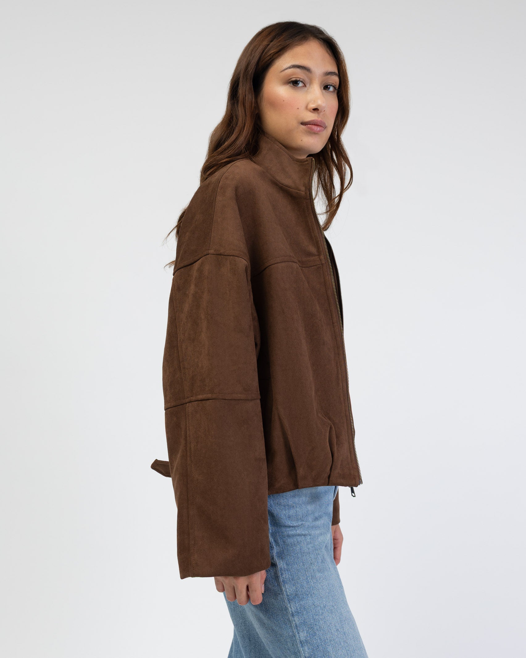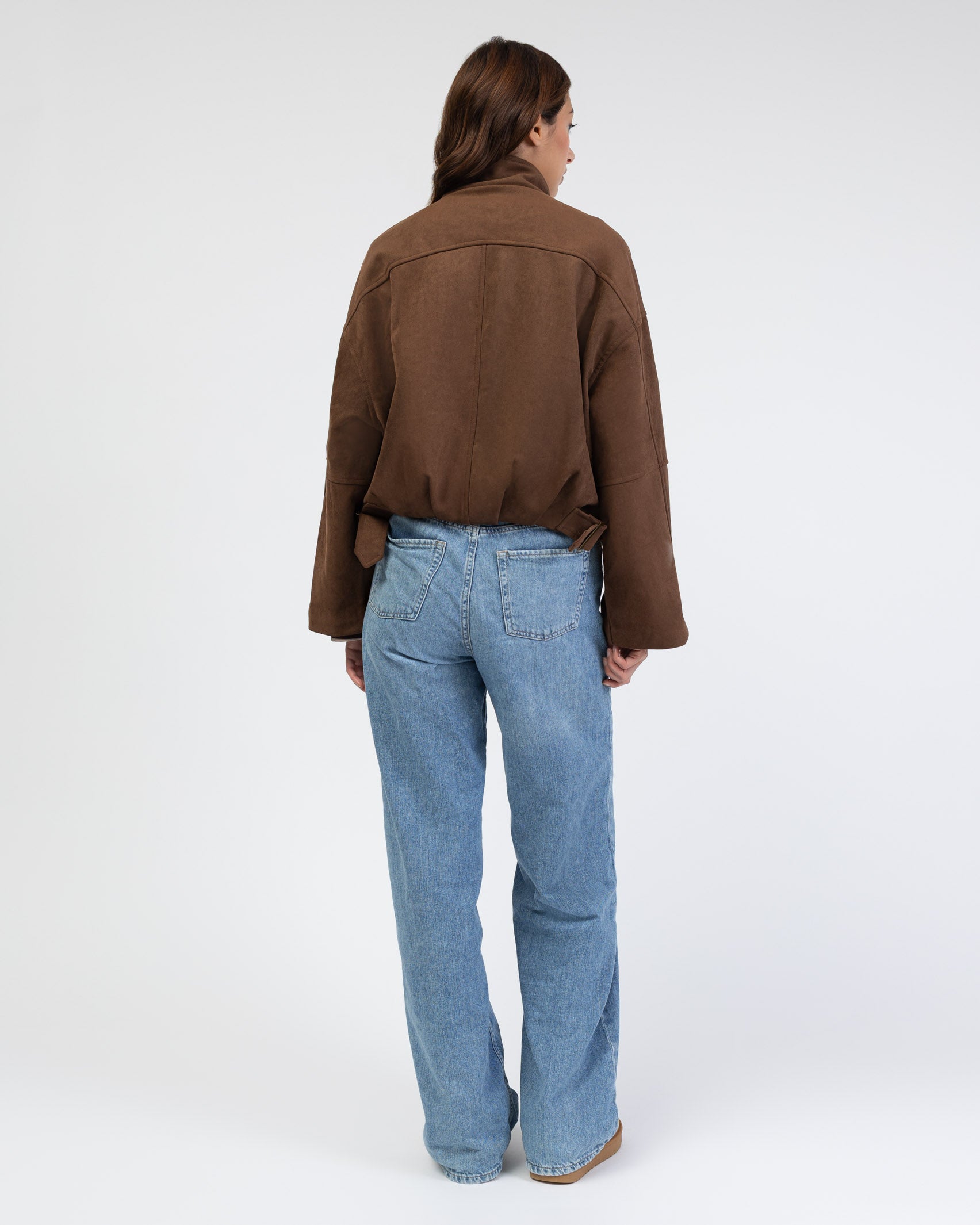- Bomberjacke in Wildlederoptik mit Ballonsaum und Stehkragen