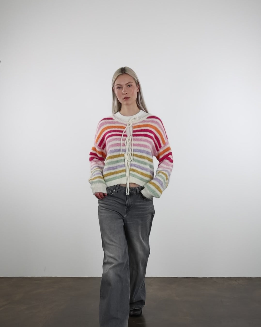 - Lockere gestreifte Strickjacke mit Bindebändern