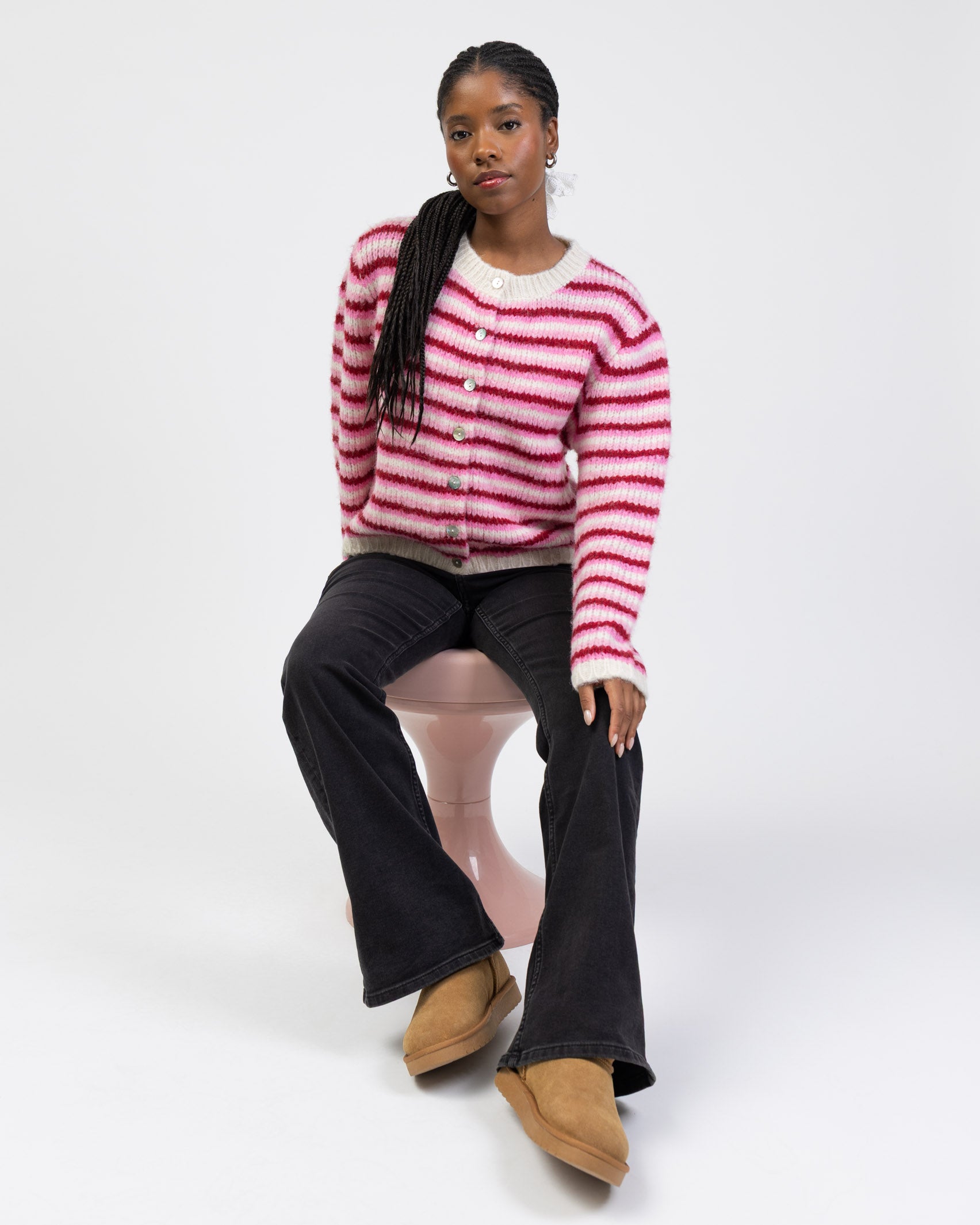 - gestreifte Strickjacke mit farblich abgesetzten Bündchen