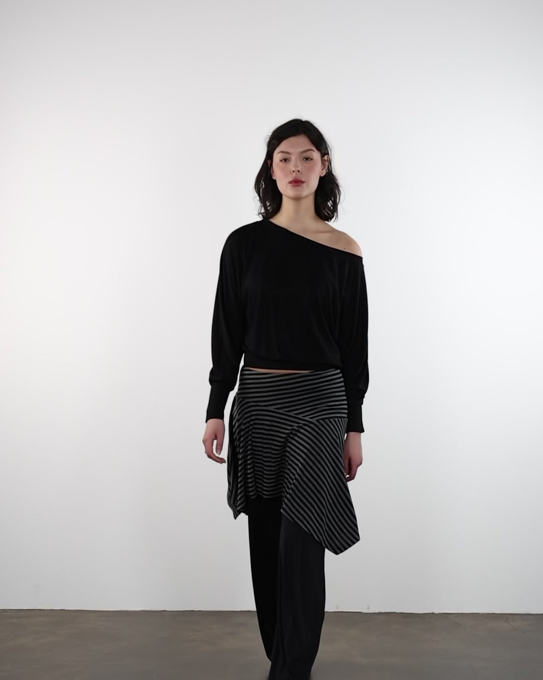 - asymmetrischer Rock aus weichem Material mit Streifen
