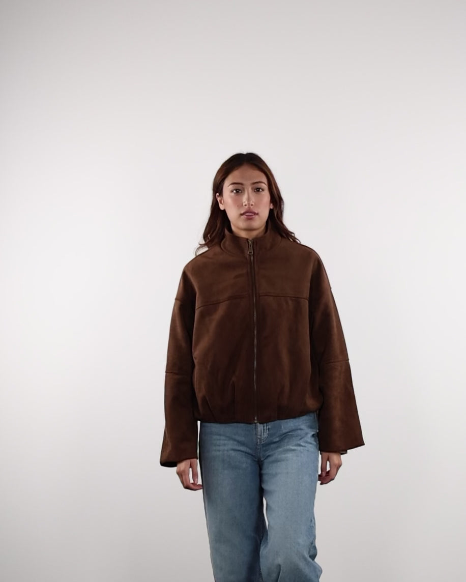 - Bomberjacke in Wildlederoptik mit Ballonsaum und Stehkragen