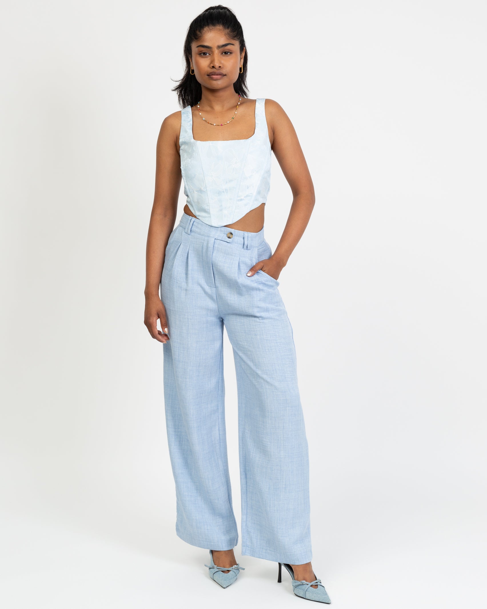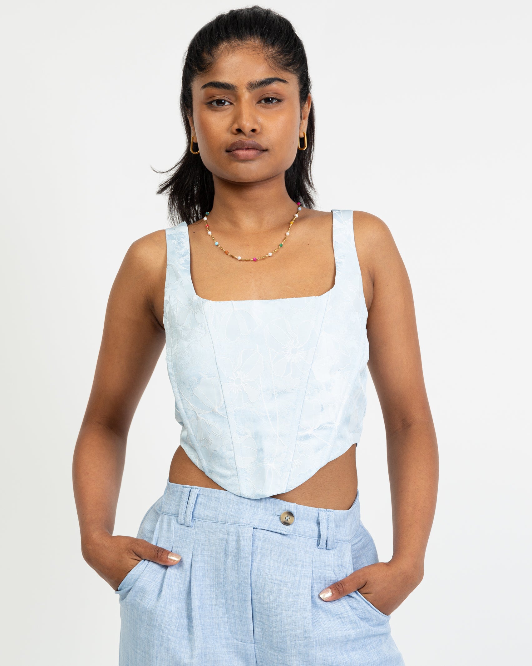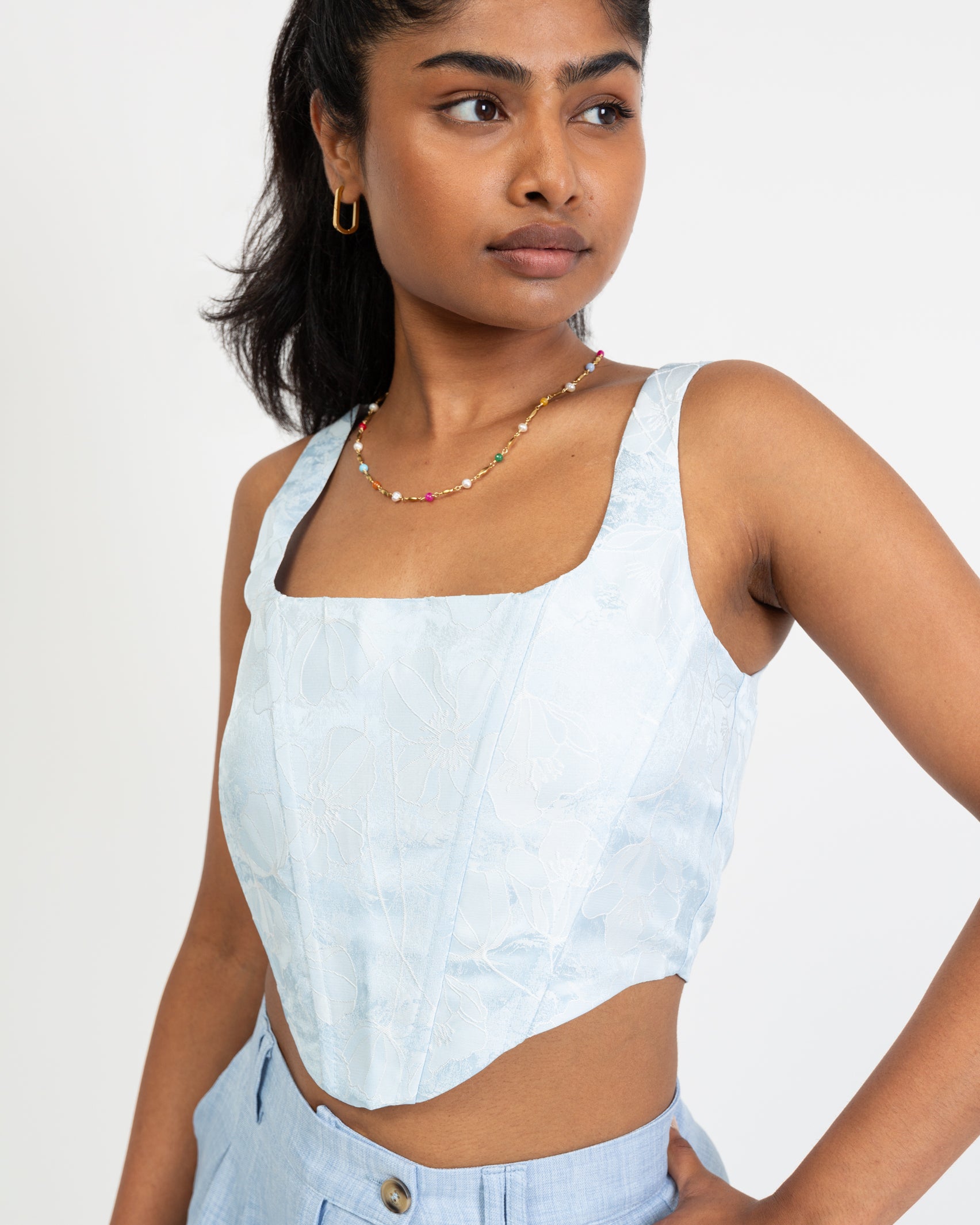 Corset top with shimmering floral pattern