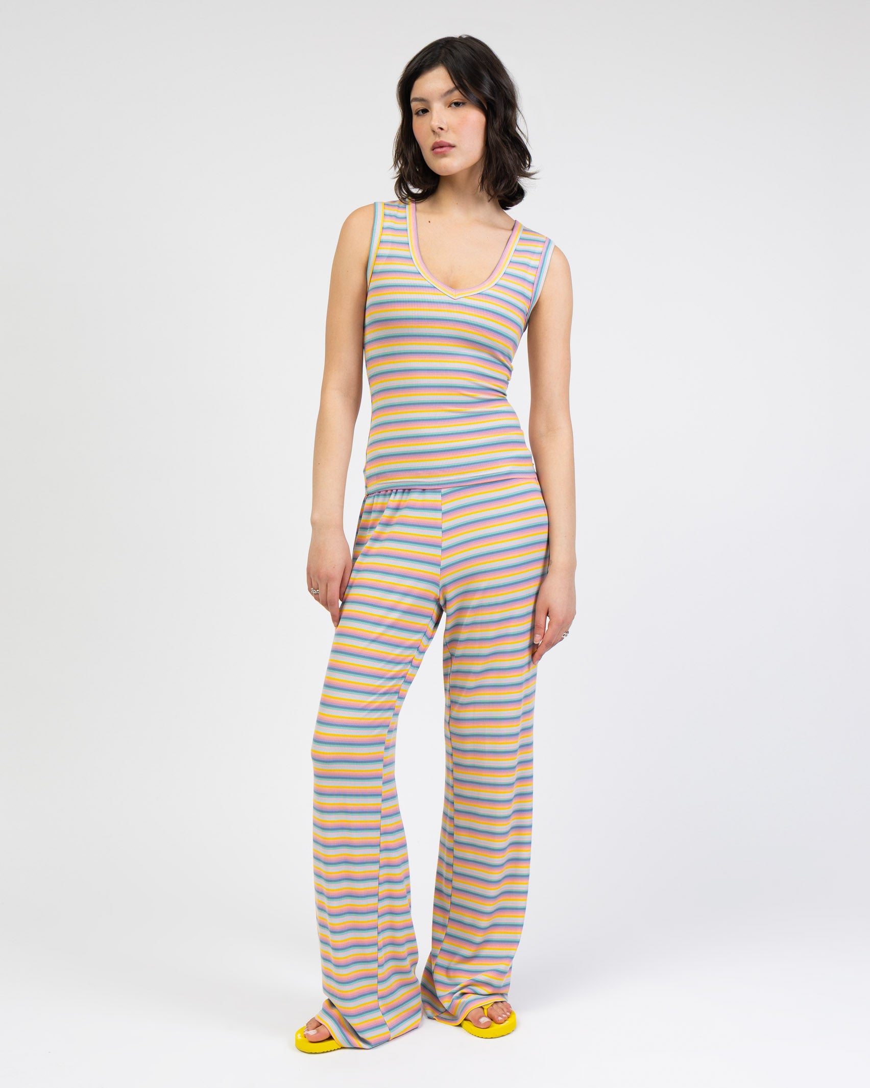 - lockere Hose mit bunten Streifen in Regenbogenfarben