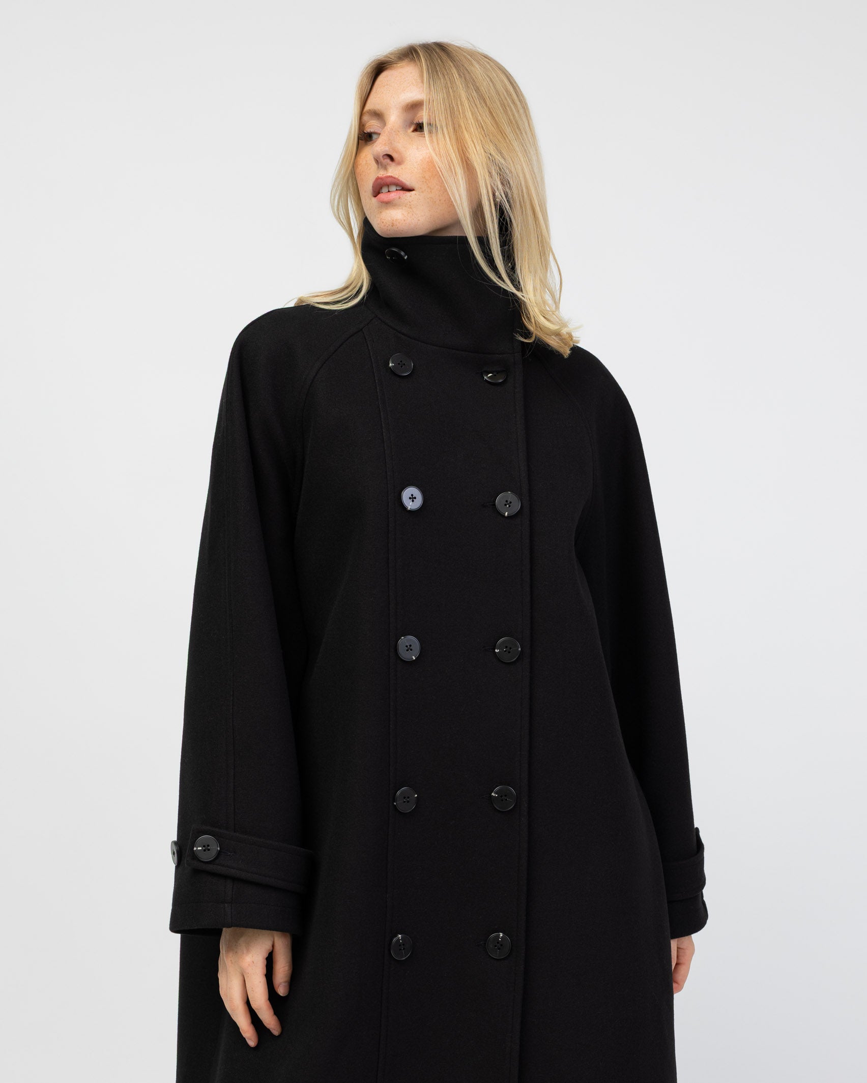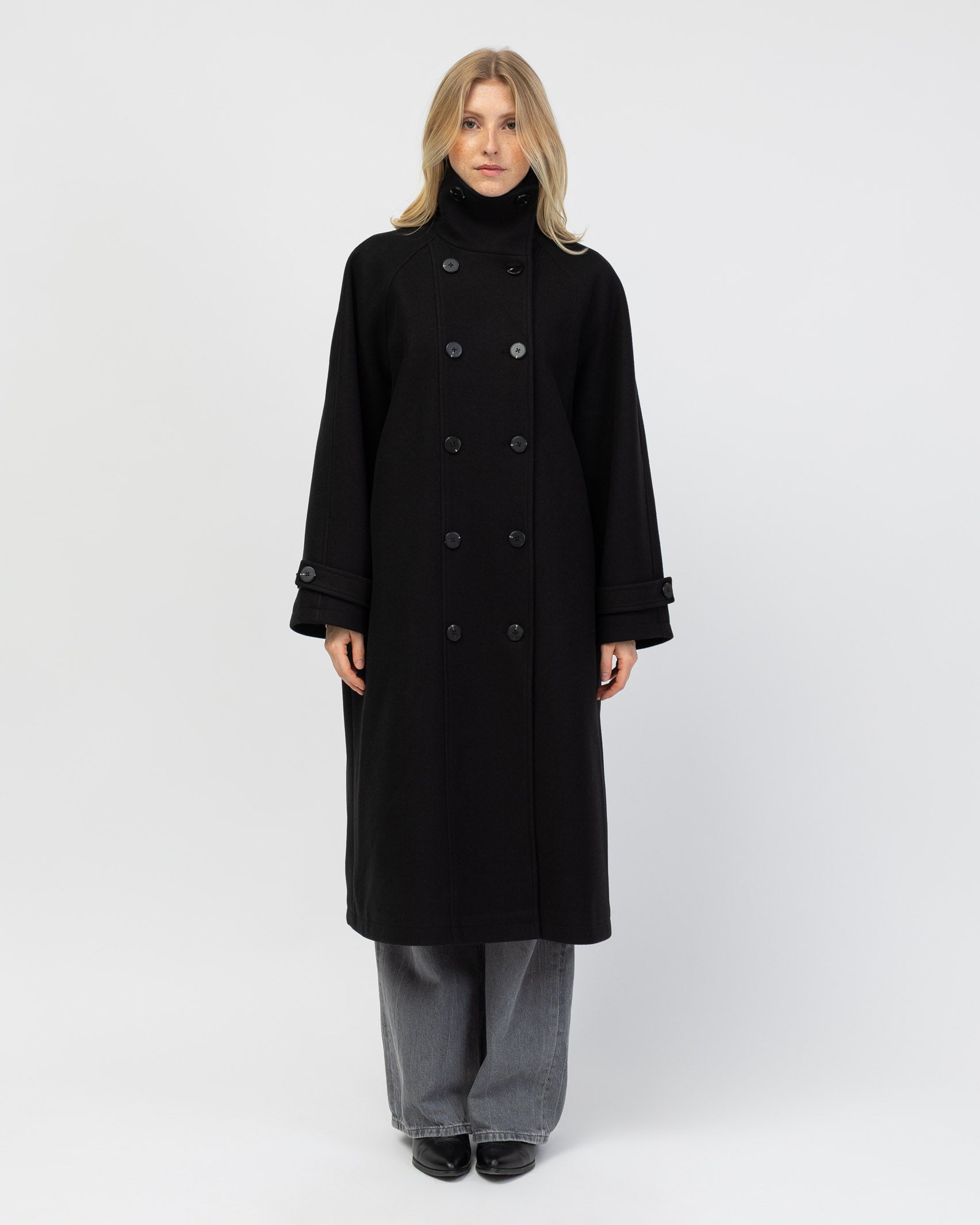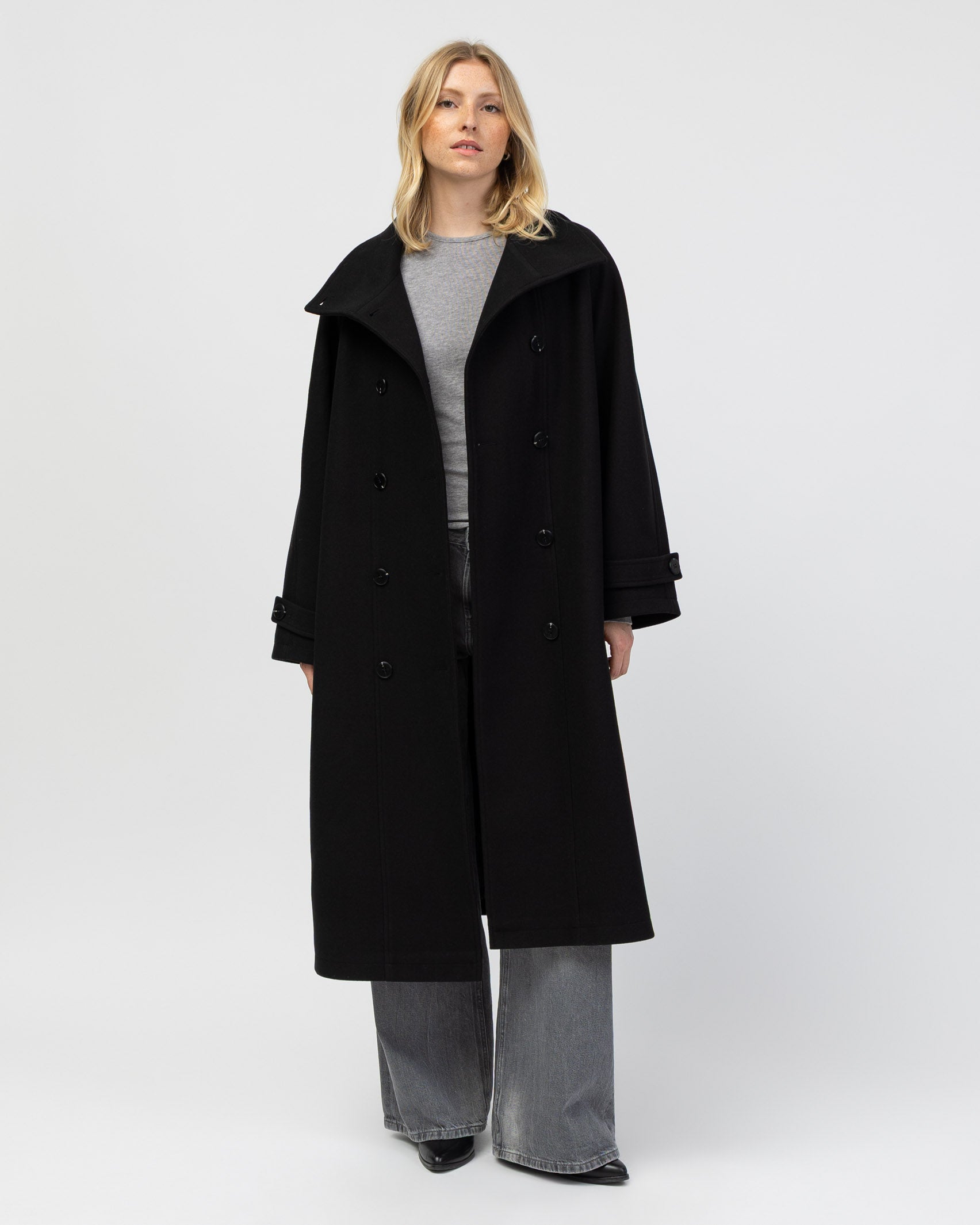 Langer Mantel mit hohem Kragen